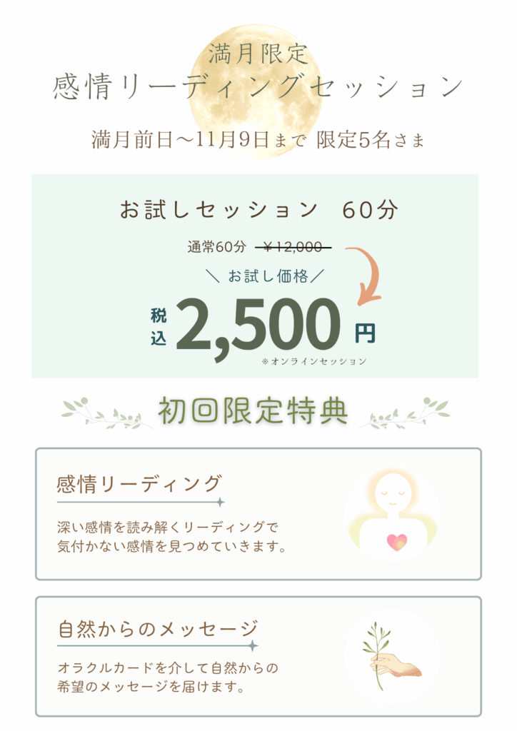 満月×立冬の感情リーディングセッションでは、自然のパワーの恩恵をお借りして、深い感情へのアプローチをして、あなたの心の奥にある「本当の気持ち」をやさしく読み解いていきます。